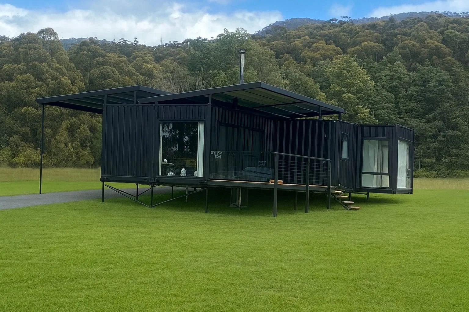 Check out our finished Custom Margate pod home. Our clients were fantastic and involved at every stage of the build from design (it was in fact their design) to completion. This 2-bedroom + 1 workshop area design works incredibly well - entrance is through a central hub foyer and mud room, branching out to each of the bedrooms and the living room comprised of 2 x 6M High Cube containers.